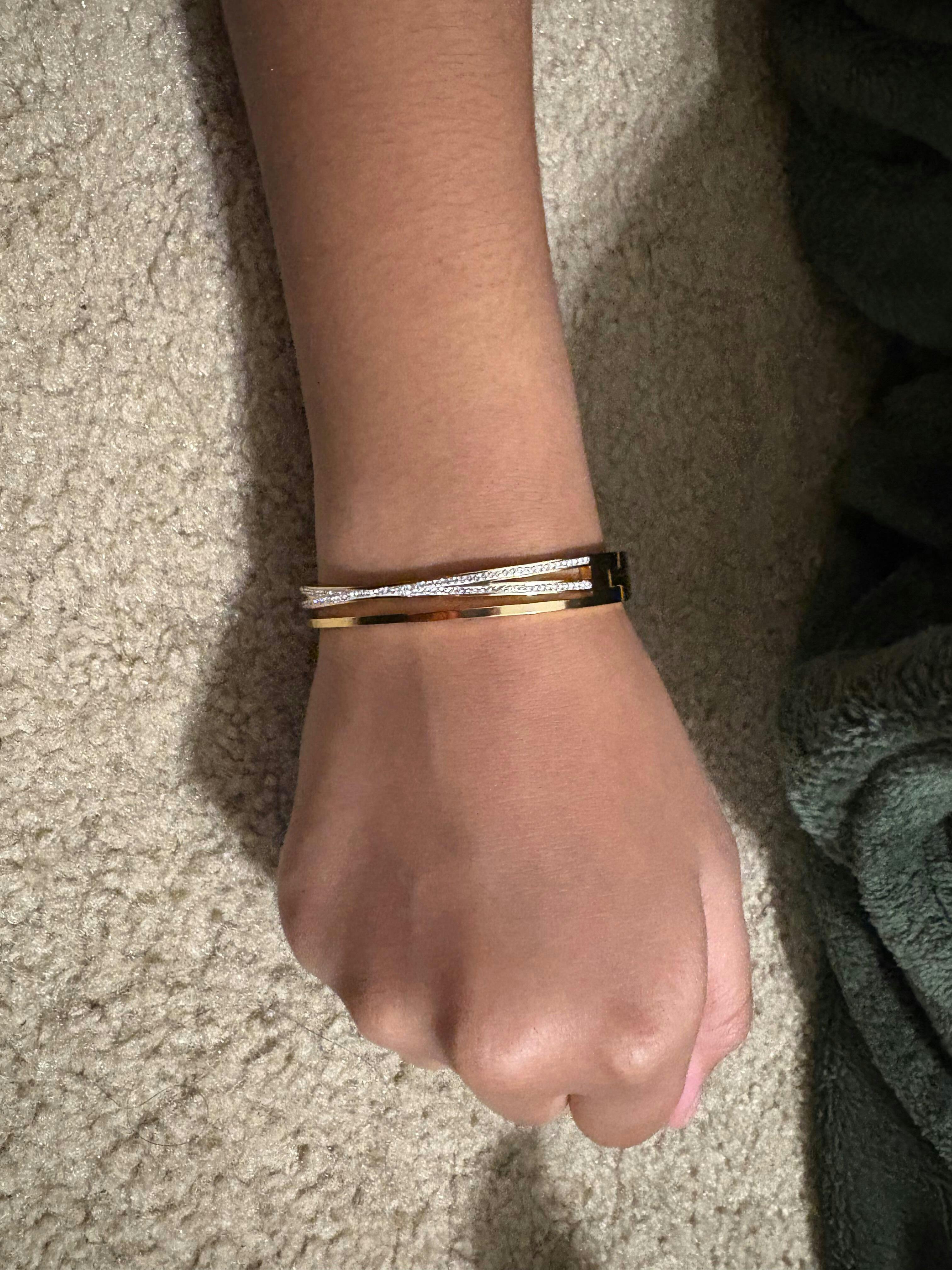 Upgrade your collection with our Glimmering Gold Bangle with Diamond Accents – Anti-Tarnish. Elegant, modern, and perfect for daily wear or special occasions.